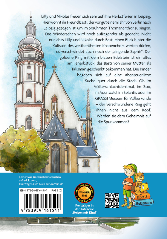 Lilly und Nikolas freuen sich sehr auf ihre Herbstferien in Leipzig. Hier wohnt ihr Freund Basti, der vor gut einem Jahr von Berlin nach Leipzig gezogen ist, um im berühmten Thomanerchor zu singen. Das Wiedersehen wird noch aufregender als gedacht. Nicht nur, dass Lilly und Nikolas durch Basti einen Blick hinter die Kulissen des weltberühmten Knabenchors werfen dürfen, es verschwindet auch noch der „singende Saphir“. Der goldene Ring mit dem blauen Edelstein ist ein altes Familienerbstück, das Basti von seiner Mutter als Talisman geschenkt bekommen hat. Die Kinder begeben sich auf eine abenteuerliche Suche quer durch die Stadt. Ob im Völkerschlachtdenkmal, im Zoo, im Auenwald, im Belantis oder im GRASSI Museum für Völkerkunde – der verschwundene Ring geht ihnen nicht aus dem Kopf. Werden sie dem Geheimnis auf die Spur kommen?